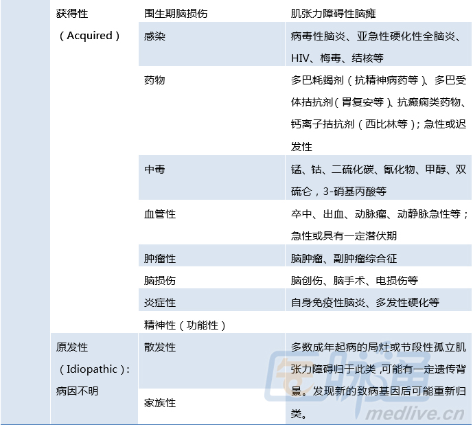 这一分类并不是病因分类,更多是描述性的,实际上大部分病因都不能囊括。另外,上述分类大多说的是隐匿起病的、具有遗传性的肌张力障碍。急性起病的,比如说急性起病肌张力障碍+肌阵挛伴意识障碍