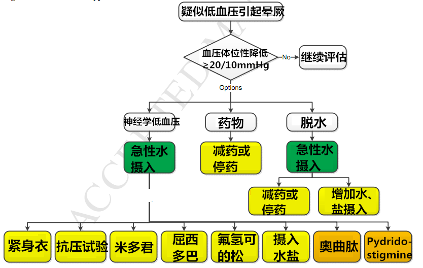 7.疑似低血压相关晕厥可能是由神经疾病、脱水或药物介导的。推荐神经性低血压或脱水患者接受液体复苏治疗以暂时缓解症状(I级推荐);减少或停用引起低血压的药物对部分患者可能是有效的(IIa级推荐);