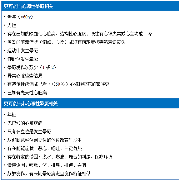 表2 与心源性和非心源性晕厥可能性增加相关的病史特征