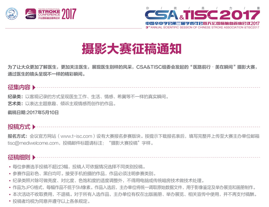 科学技术的高速发展,推动着各领域发生着时代性变革,脑血管病领域也不例外,从学科体系结构、诊疗技术、临床焦点、医学研究、医疗模式、医师教育培训等都发生着翻天覆地的变化。“中国卒中学会第三届学术年会暨天坛国际脑血管病会议2017”将于2017年6月23日-25日在北京国家会议中心召开,大会将在这些方面为大家呈上一个视野辽阔、不同纬度、不同视角、与时俱进的脑血管病学术交流的交响曲。