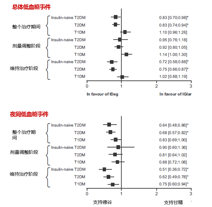 ● III期研究的荟萃分析显示,德谷胰岛素与甘精胰岛素相比,在1型糖尿病