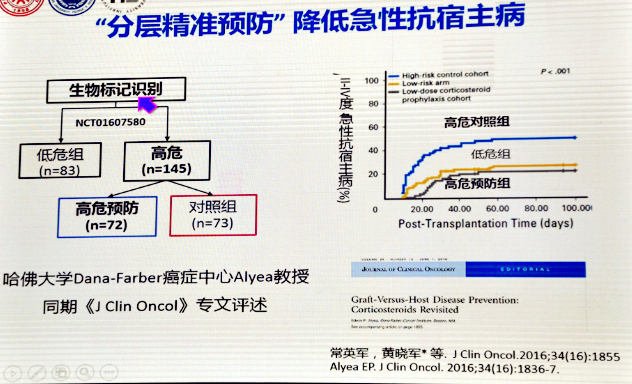 另外,研究发现G-CSF联合抗胸腺球蛋白诱导免疫耐受,保证了单倍体移植的植入,降低了抗宿主病发生率,这也正是近年来我国移植领域最主要的发展——北京方案。哈佛大学的Alyea教授在Journal of Clinical Oncology杂志发表的述评以及常英军,黄晓军等同期发表的研究发现,生物标记物高危组患者的CVHD发生率高于低危组,这就表明精准分层科能降低急性GVHD风险。