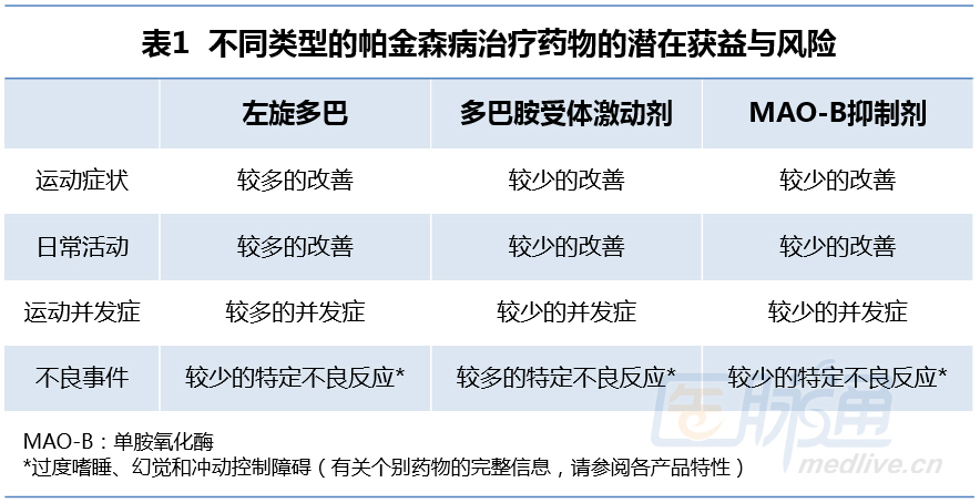 ➤ 对于早期阶段的帕金森病患者,当运动症状不会影响生活质量时,考虑选择多巴胺
