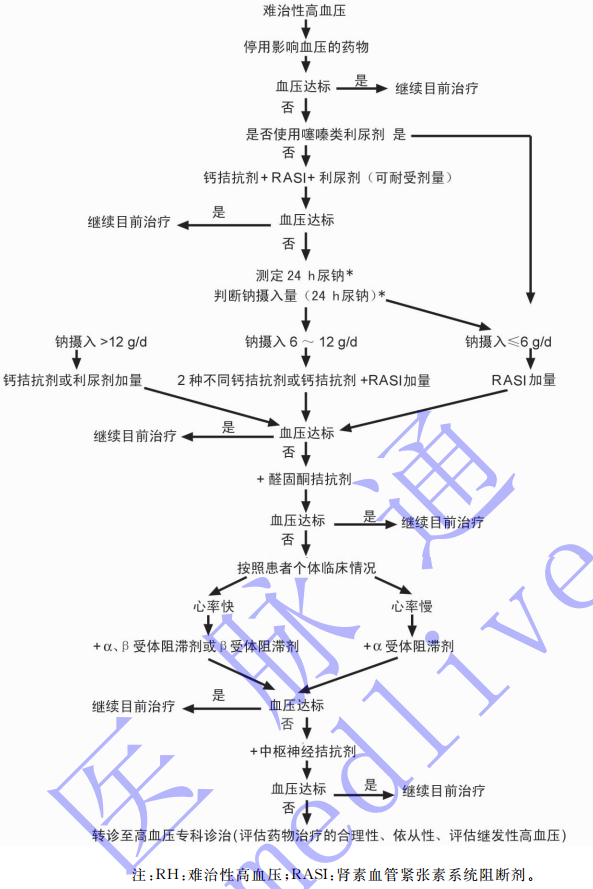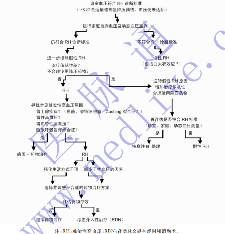 的方法共同评价血压,在此基础上如已采用3种以上最佳剂量、最合理配比的联合治疗方案(包括利尿剂)后血压仍然在目标水平以上方可确定为难治性高血压;