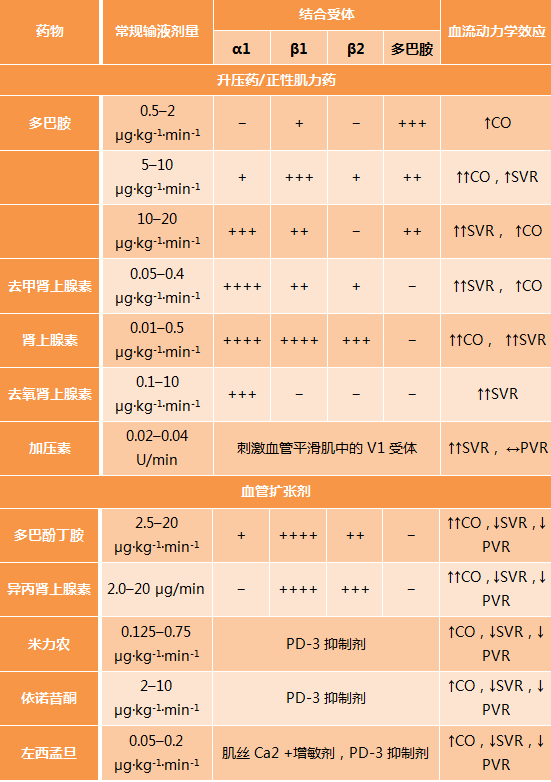 表3 血管活性药物的作用机制和血液动力学作用