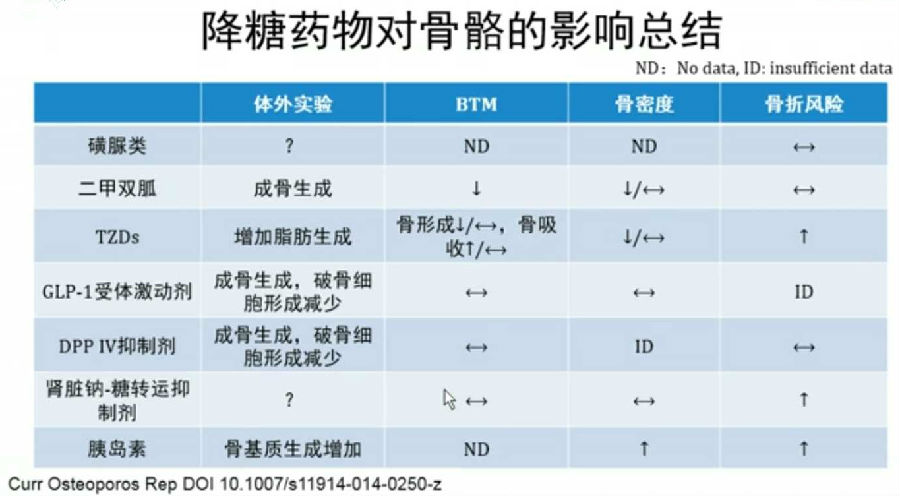 抗骨质疏松药物对糖代谢的影响 荟萃研究显示,抗骨质疏松药物可能减少糖尿病发病风险;抗骨质疏松药物对空腹血糖及患者体重影响不大。而降糖药物对骨骼的影响如下图所示:
