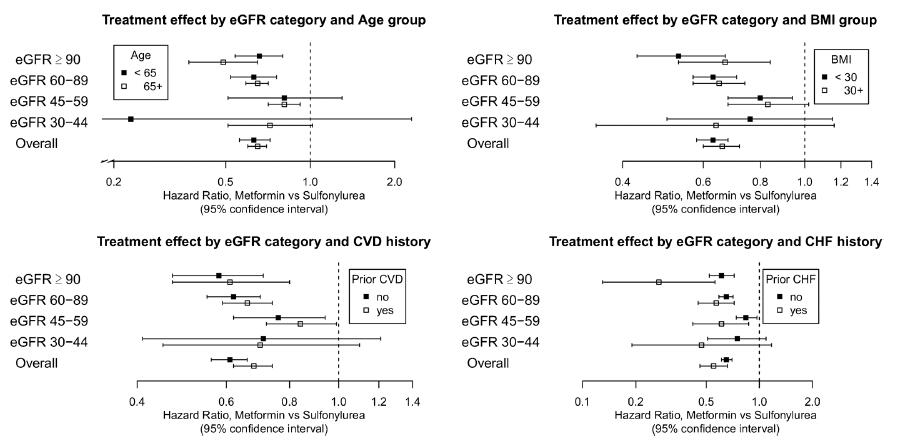 eGFR≥ 90、60-89、45-59 ml/min/1.73m2的患者,使用二甲双胍和磺脲类药物治疗其死亡风险无显著差异;eGFR为30-44 ml/min/1.73m2的患者,使用二甲双胍和磺脲类药物治疗其死亡风险具有显著差异(死亡人数减少12.1/1000人年;95%CI:5.2-19.0;见表1)