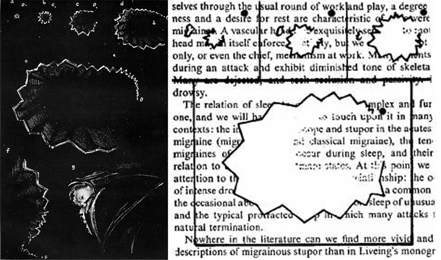 | “我首先注意到的是视觉症状,一开始出现的是像印刷错误似的盲点,或者看不到一个人的下巴,有时失去一半的视野。症状高峰是物体周围出现锯齿状的线条,感觉像是通过一面破碎的镜子观看到的场景。另外我说话也受到了影响,不能把句子连在一起,这让我感到困惑和迷茫。这是偏头痛发作中最痛苦的部分,持续约15至20分钟,然后我的视力开始恢复,同时头部开始出现单侧疼痛。” |