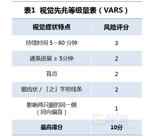 询问患者“您在头痛之前是否有过持续5~60分钟的视觉障碍?”对于筛选偏头痛患者是很有帮助的。但是需要注意,这种问诊方法并不是很特异,有可能将无先兆偏头痛过度诊断成先兆性偏头痛患者。相比之下,基于国际头痛协会诊断标准制定的视觉先兆等级量表(VARS)则更为敏感和特异(表1)。若患者的得分≥5分,则诊断先兆性偏头痛的敏感性为96%,特异性为98%。