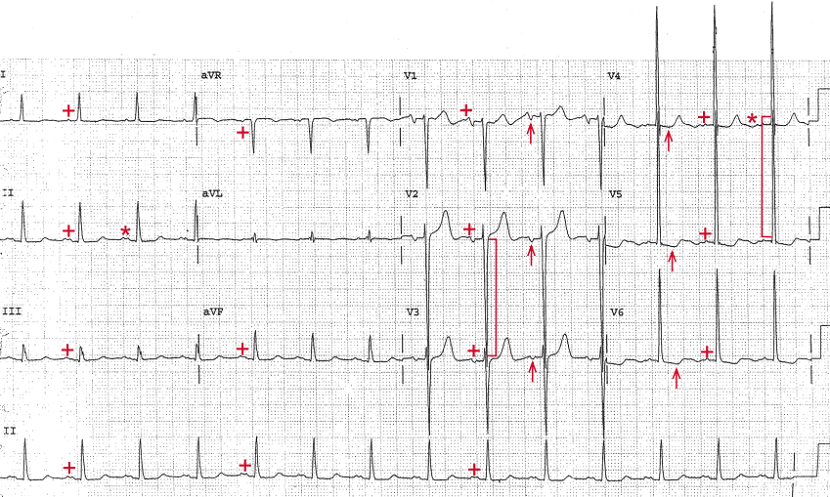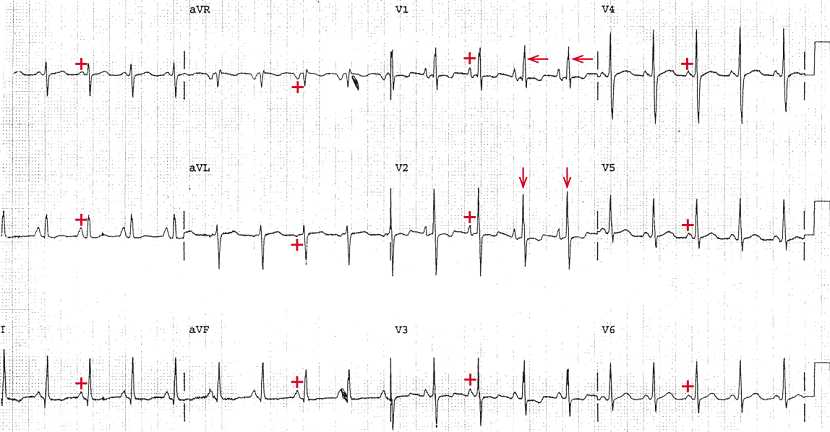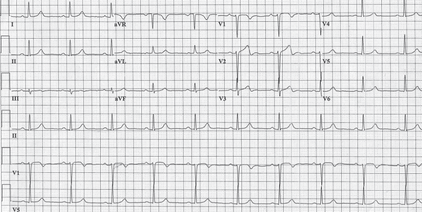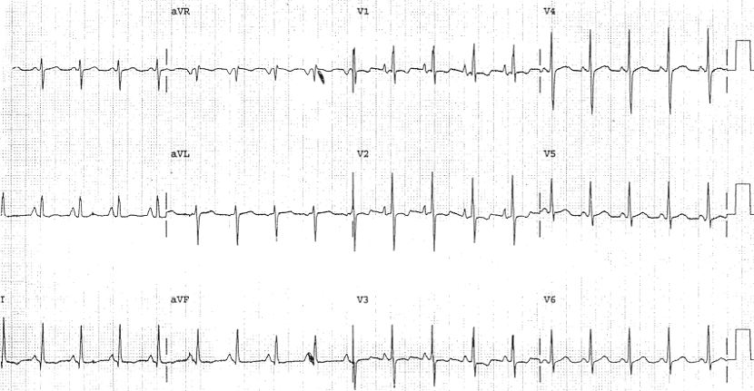 QRS波时限正常(0.08s)。QT/QTc间期正常(300/410ms)。但是,QRS波形态异常。电轴右偏,在+90°和+180°之间(QRS波在Ⅰ导联为负向,在aVF导联为正向)。主要表现在V1导联R波偏高(←),即振幅超过7mm(7个小格)或者R/S>1。V1导联上高的P波加上电轴右偏和肺型P波(右心房肥厚)是右心室肥厚(RVH)的特征。此外,在V2导联(↓)上也有一个高的R波。虽然这可能是RVH导致的,但也可能表明电轴在水平面是逆时针方向转位。这可以通过膈下位心脏成像加以确认;右心室在前边,左心室在左侧。逆时针方向转位会出现提前转化,也就是说,左心室电势向前移位,而其在胸前导联发生得更早。
