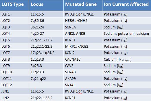 根据QT间期延长的心电图特点及突变基因位点不同,临床又可把长QT综合征分成LQT1、LQT2、LQT3……等亚型(表1),1-3型占了全部长QT综合征的95%以上。
