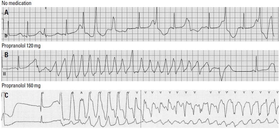 令人惊讶的是,普萘洛尔120 mg剂量时,诱发了尖端扭转型室速,160 mg剂量时,诱发了持续性室速,同时伴黑曚、头晕等血流动力学不稳定症状(图3)。普萘洛尔,非但没有抑制该患者的恶性心律失常事件,反而起到了恶化的作用。如果不是患者主诉心悸症状加重而进行了肾上腺素激发试验,患者应用普萘洛尔出院极有可能猝死!