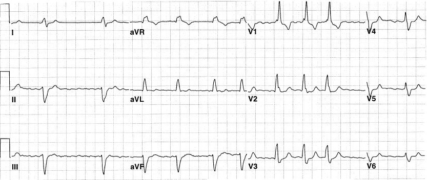 图3 左束支阻滞心电图表现,可见V1导联为QS型,V5、V6导联为R波