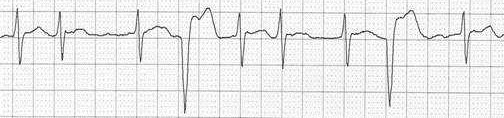 对于房早、交界区早搏或房速等伴有的差异性传导,通过提前的P波,后面伴随增宽的QRS波、常表现为右束支阻滞图形、无固定联律间期、无代偿间歇等特征,易于判断。如图4中,窦性P波节律规则且快速,符合窦性心动过速的诊断;另有频发房性早搏(呈二联律),下传心室波分别呈左束支传导阻滞型或右束支传导阻滞型图形,为典型的差异性传导。