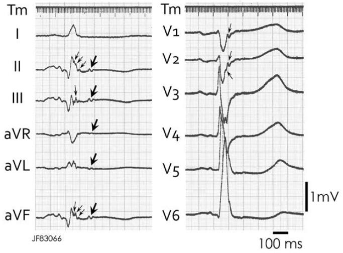 复律后的窦缓,可能有人质疑,因为在图1B中的胸导联上,T波后面疑似存在P波(红色箭头),是否是2:1房室阻滞?而对应的肢体导联,相应位置异常平静,未见任何波澜,结合患者长期服用胺碘酮及美托洛尔的病史,考虑胸导联上的波为U波,延长的QT间期也支持这个结论。而图2中放大的心电图可见,图1中“诡异”的波实际为II、III、aVF、V1、V2导联QRS波终末的碎裂电位(细箭头),除I导联外的肢体导联,QRS后还存在晚电位(粗箭头)。