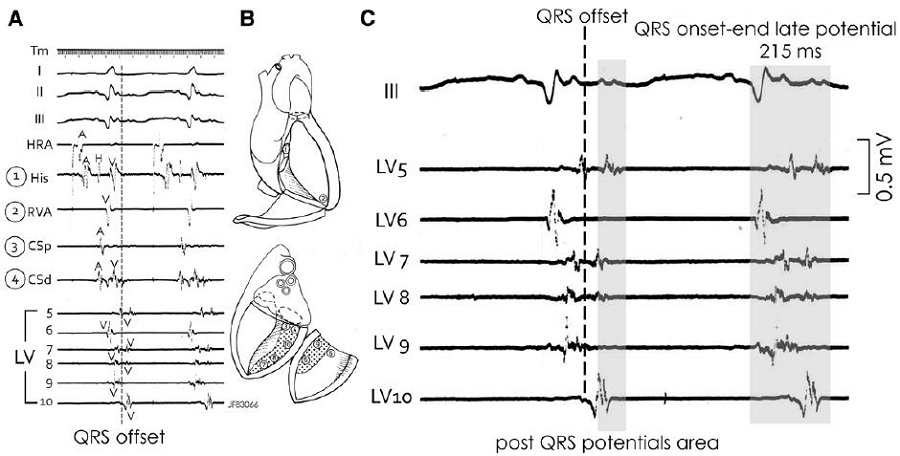 对比我们的患者,除了本例在体表心电图即可清楚显示外,其他的特点基本都符合。为了验证上述心电图表现,我们进行了心内电生理标测,在心电图室速的对应部位(左室下后壁)记录到了类似体表心电图的碎裂心室波(图3A)。放大来看,心室波前后绵延,开始至结束竟增宽至215 ms(图3C)。