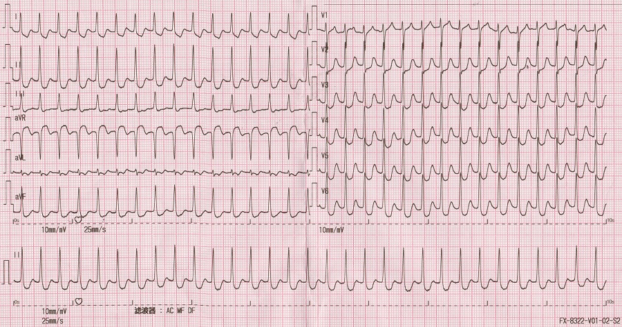 图3 左侧旁道介导的房室折返性心动过速,可见明显的aVR导联ST段抬高