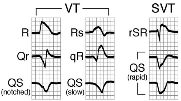 图4 Vereckei等提出的aVR导联单导联QRS波形态对宽QRS波心动过速鉴别方法,aVR导联R波,存在R波或Q波宽度>40ms,S波有切迹,或前缓后陡,均提示为室速,敏感性可达98%