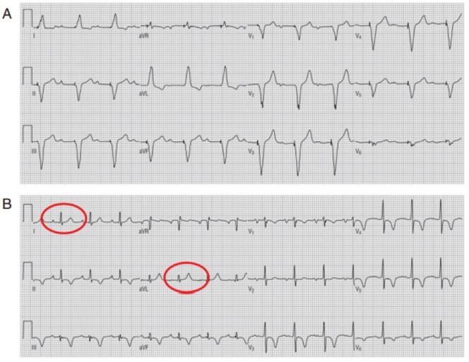 (A),窦律恢复后,可见除I和aVL导联外,其余导联T波均倒置(B)