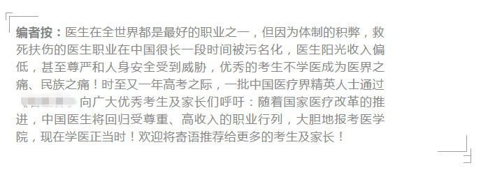 最近《中国医界精英寄语高考生及家长,医生将成最好职业》这篇文章刷爆了朋友圈,文中罗列了诸多医学大咖的寄语,呼吁大家学医还是很有前途的,将来一定会收获满满!不知各位考生和家长动心了没有?