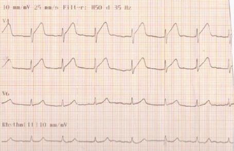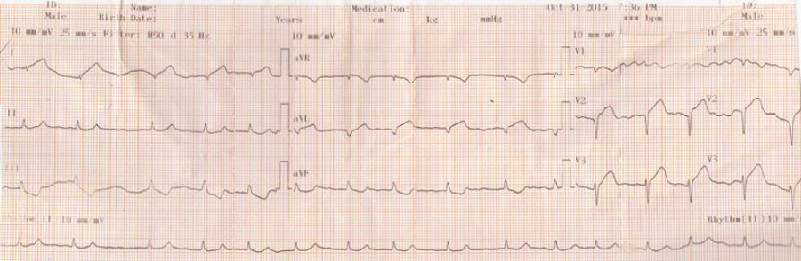 图2 可见V4-V6导联ST段抬高0.1-0.2 mv