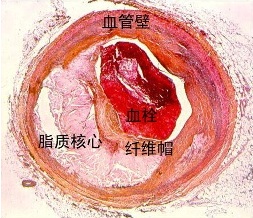 图3 动脉粥样斑块破裂,继发血栓形成,导致心肌梗死