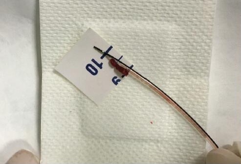 300mg嚼服,联系心内科导管室。转入导管室后行急诊PCI,冠脉造影发现前降支中段完全闭塞(图4),和预想的一样,但观察其闭塞部位类似树枝折断样的改变,考虑为血栓栓塞所致,立即行导管抽吸,抽出新鲜血栓(图5)。