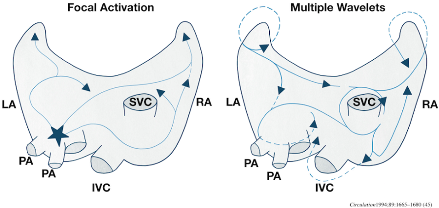 图1 房颤的发病机制(左:自律性病灶机制;右:多子波折返机制)