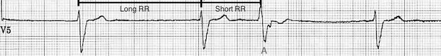 窦性心律时室性期前收缩后面一般有完全性代偿间歇,而房颤时室性期前收缩后面的代偿间歇无法判定是否为完全性,因此称为“类代偿间歇”。由于隐匿传导,类代偿间歇常长短不一,但一般比房颤的平均R-R间期为长。