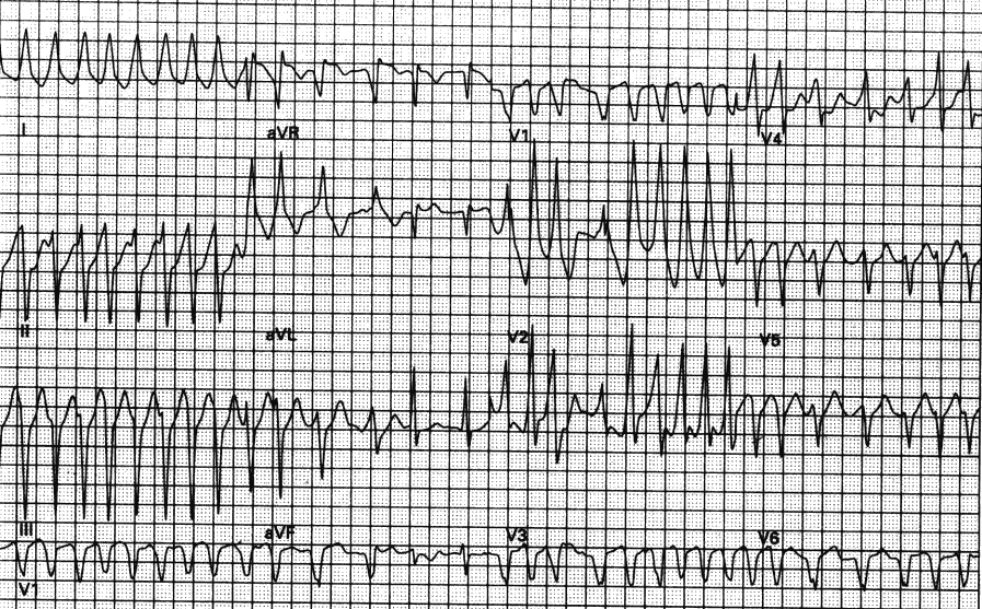 房颤伴预激综合征或预激综合征合并房颤,心电图多表现为频率快速且节律不齐的宽QRS心动过速