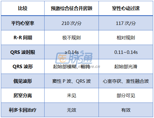 。QRS波群在宽度以及形态上呈多样性,心室率较快,一般超过200次/分,这点与房颤合并差异性传导不同,一般只有存在预激时,心室率才会如此快。