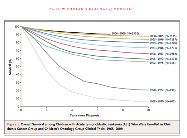 图1968-2009年儿童急性淋巴细胞白血病(ALL)入选儿童癌症组和儿童肿瘤组临床试验的总体存活率。