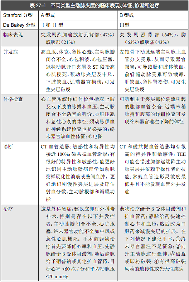 根据其解剖特点主动脉夹层有几种分类方法(见图27-3)。起病<2周为急性主动脉夹层;其余则为慢性。