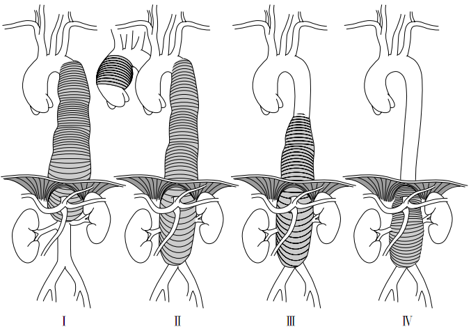 图27-4主动脉瘤的Crawford分级系统 (Reprinted, with permission, from Edmunds LH Jr, ed. Cardiac Surgery in the Adult. New York: McGraw-Hill; 1997).