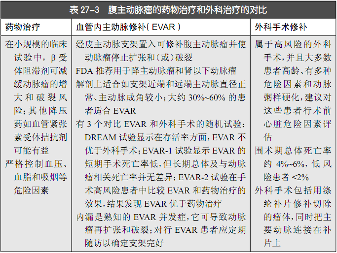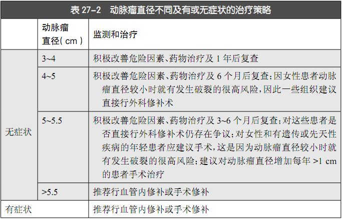 治疗:治疗策略是由患者的症状、动脉瘤大小、并发症或终末器官受累情况决定(详见表27-2、表27-3和表27-4)。