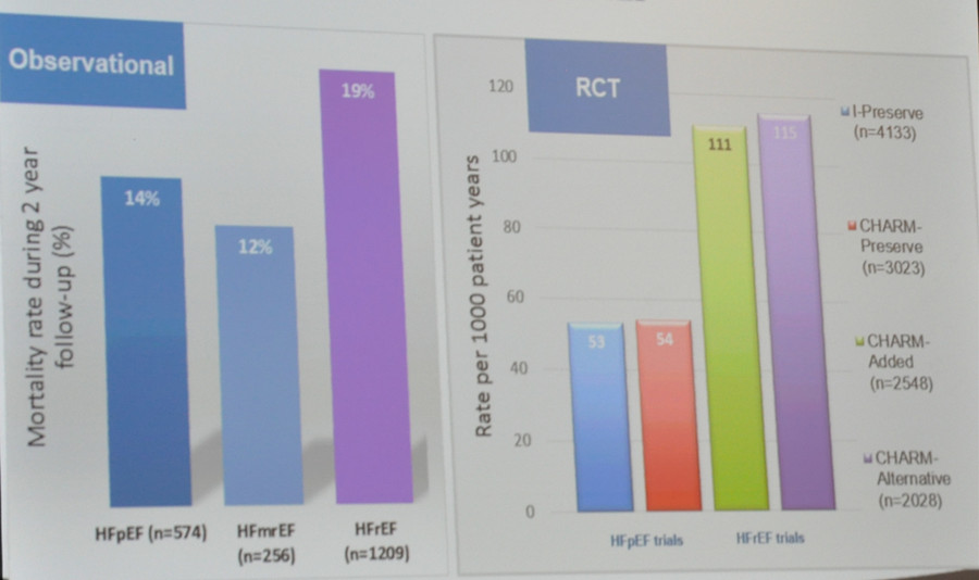 HFpEF患者的死亡率高于同龄人,但总体上低于HFrEF患者。另外,观察性研究显示的HFpEF患者死亡率较RCT试验高,如图1。