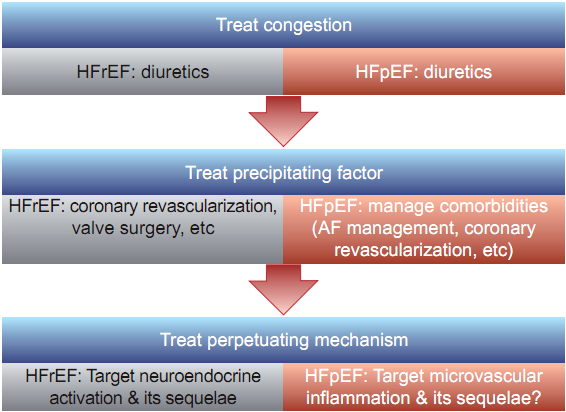 首先,利尿剂治疗可使HFpEF和HFrEF两类心衰患者获益。其次、可进行病因治疗。最后、针对心衰机制进行治疗,如图3。