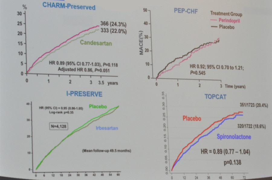 目前指南上推荐的血管紧张素转换酶抑制剂(ACEI)、血管紧张素Ⅱ受体拮抗剂(ARB)、醛固酮受体拮抗剂、β受体阻滞剂等药物在降低HFrEF患者的硬终点事件方面均有效。但针对HFpEF药物治疗(坎地沙坦、培哚普利、厄贝沙坦、螺内酯)的多项随机对照试验,在心血管死亡和心衰住院的复合终点事件方面均获得了阴性结果,如图4。