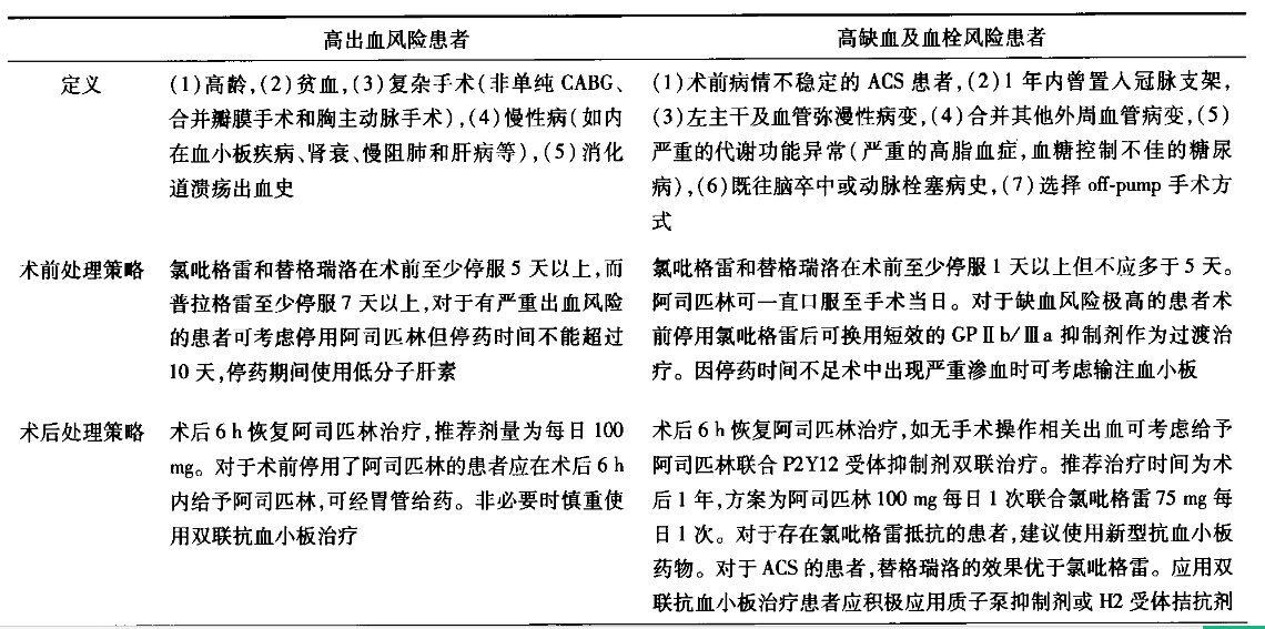 对于拟行CABG的患者应在术前给予阿司匹林100 mg/d。原则上术前不必停用阿司匹林,特别对于病情不稳定的患者。术前,应停服氯毗格雷和替格瑞洛至少5d,普拉格雷至少7天,停药期间可配合使用低分子肝素