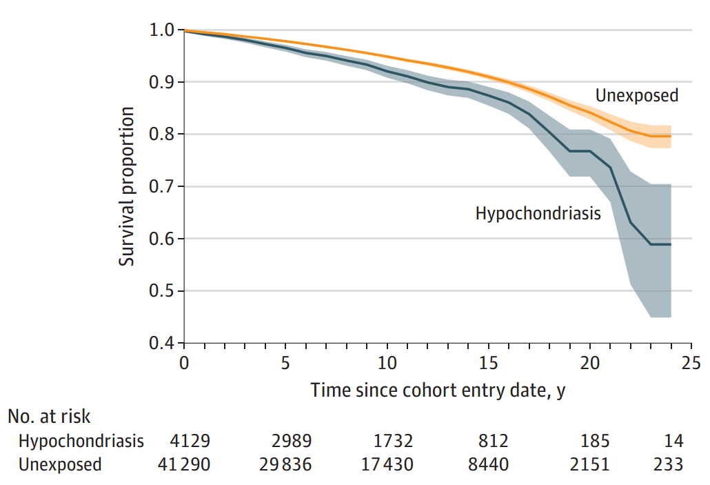 本项纳入4,129名疑病症患者及41,290名对照的研究得出了一个悖论:疑病症患者尽管普遍担心疾病和死亡,但随访期间的死亡风险却高于一般人群,无论是全因死亡(高69%)、自然原因死亡(高60%)还是非自然原因死亡(高143%)。
