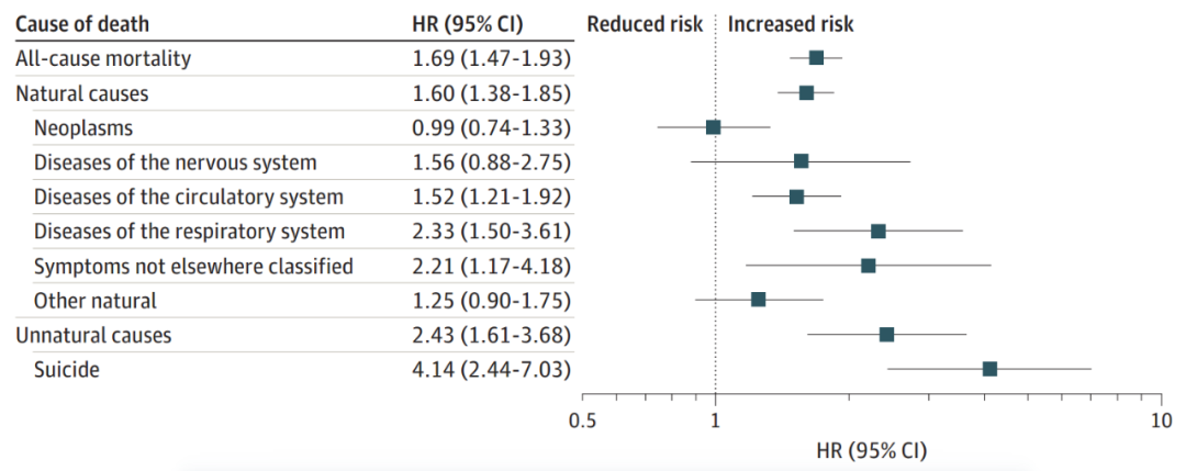 ,疑病症患者的自杀死亡风险是对照的4倍以上(HR, 4.14; 95% CI, 2.44-7.03),但这一差异在调整抑郁和焦虑相关障碍后不再具有统计学意义。