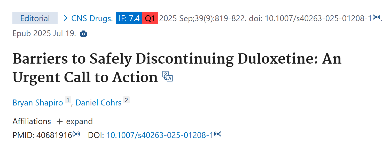 文献索引:Shapiro B, Cohrs D. Barriers to Safely Discontinuing Duloxetine: An Urgent Call to Action. CNS Drugs. 2025 Sep;39(9):819-822. doi: 10.1007/s40263-025-01208-1. Epub 2025 Jul 19. PMID: 40681916.
