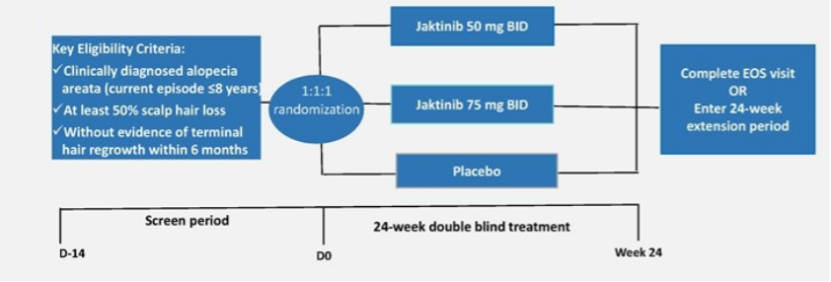 本研究为随机、双盲、多中心3期试验,纳入脱发严重程度工具(SALT)评分≥50的患者,按1:1:1比例随机分配至50 mg吉卡昔替尼组、75 mg吉卡昔替尼组或安慰剂组,每日两次(BID)治疗24周。分层因素包括疾病严重程度(S3、S4、S5)和斑秃发作持续时间(≤4年与>4年)。主要终点为第24周SALT评分≤20的患者比例,次要终点包括SALT≤10、SALT改善50%/75%/90%(SALT50/75/90)、眉毛/睫毛反应、生活质量(QoL)变化及不良事件(AEs)。