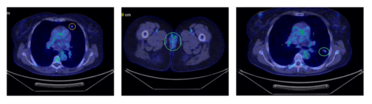 图1 首次PET-CT显示双肺多发非钙化性结节(以黄色和绿色圆圈标出)