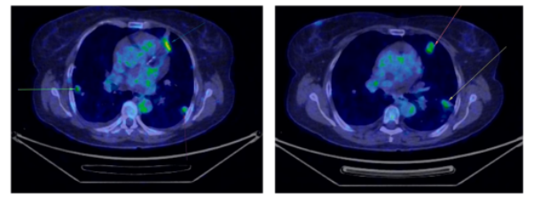 图2 第二次PET-CT扫描显示肺部病灶进展(以箭头标示)