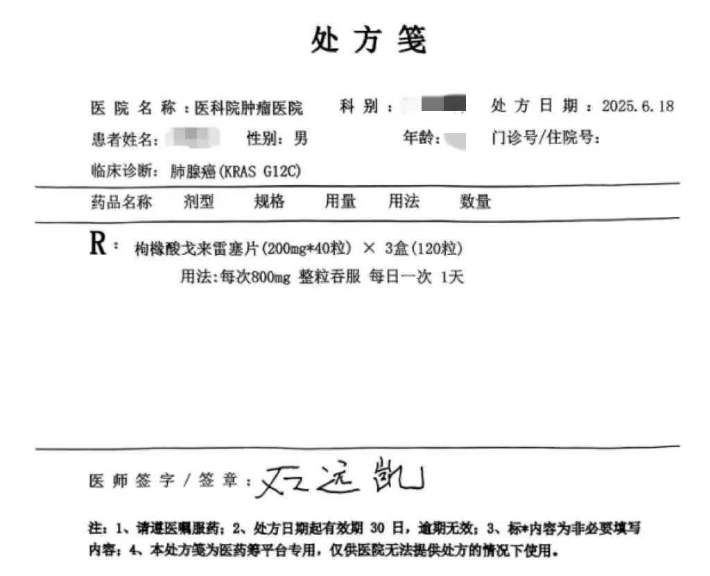 2025年5月22日,戈来雷塞正式获得中国国家药品监督管理局(NMPA)批准上市,用于至少接受过一种系统性治疗的KRAS G12C突变晚期非小细胞肺癌(NSCLC)成人患者的治疗。戈来雷塞上市不仅丰富了KRAS G12C突变晚期NSCLC患者的治疗选择,也进一步提升了KRAS G12C抑制剂在中国的治疗可及性。2025年6月18日,戈来雷塞全国首张处方已于北京、上海同步开出,标志着其正式落地临床实践(图1)。值此之际,医脉通特邀中国医学科学院肿瘤医院石远凯教授和上海市胸科医院钟华教授从临床实践的角度出发,探讨戈来雷塞的临床价值与应用前景。