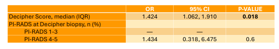 Decipher GC评分经标准化处理,系数反映0.1单位的评分变化。研究采用单因素及多因素逻辑回归分析筛选出与病理升级或不良病理显著相关的预测因素,并使用Wilcoxon秩和检验、Pearson卡方检验及Fisher精确检验进行统计分析。