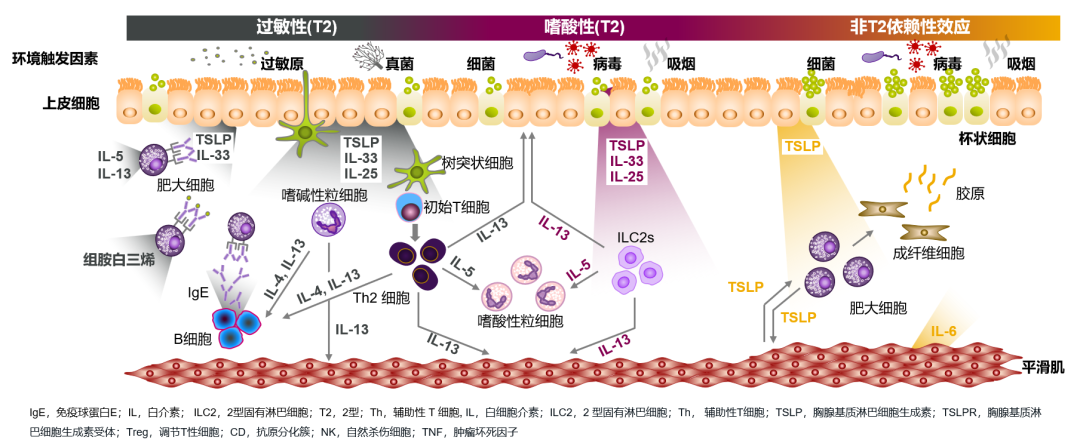 气道上皮作为呼吸道的第一道防线,在受到过敏原、病毒、污染物等刺激时,可迅速释放TSLP、IL-33和IL-25等上皮源性细胞因子。这些预警素作为免疫应答的"启动信号",处于炎症网络的顶端,被称为上游炎症"总开关"[5,6]。
