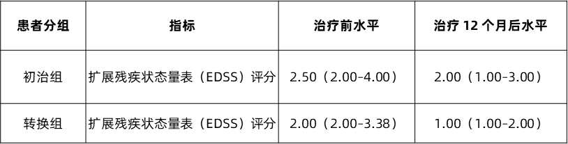 ➤ 残疾改善(EDSS评分):随访12个月,初治组和口服DMT治疗转换组患者EDSS评分均显著下降(P均<0.001)(表1)。且从残疾改善比例来看,初治组中 52.6% 的患者实现残疾改善,转换组中 45.7% 的患者实现残疾改善,进一步印证了奥法妥木单抗在改善患者残疾进展、提升生活质量方面的临床价值。