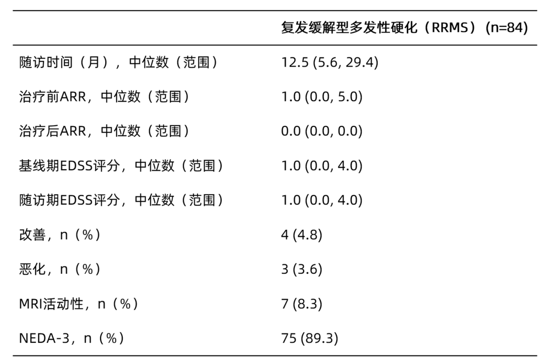 华山医院团队开展的中国真实世界研究,纳入了102例应用奥法妥木单抗治疗≥6个月的中国MS患者,中位发病年龄26.7岁,应用奥法妥木单抗治疗前的中位病程时间为34.7个月,研究结果显示2(表2):